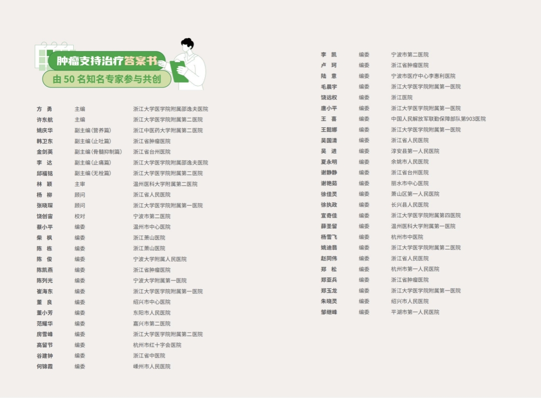 2024年,丁香园与浙江省50位知名肿瘤专家共同推出的《肿瘤支持治疗答案书》(以下简称答案书)正式发布。该答案书旨在帮助肿瘤患者科学认识抗肿瘤治疗中出现的不良事件,学会实施有效的自我护理措施,建立良好的医患沟通渠道。